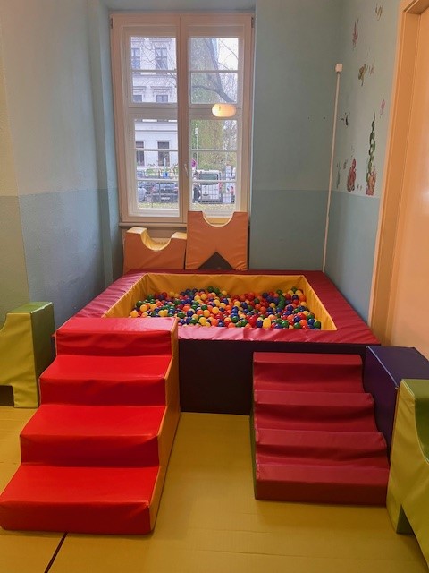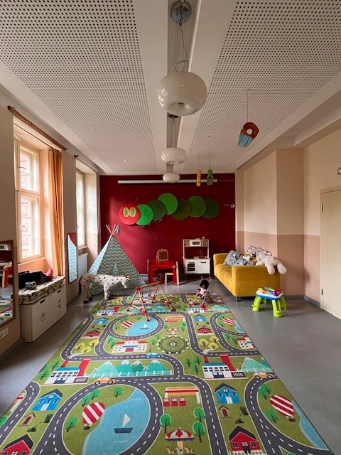 Im Familienzentrum gibt es einen großzügigen offenen Bereich mit Caféraum, Spielzimmer, Ruheraum, Kleidertauschraum und einem kleinen Toberaum mit Bällebad.